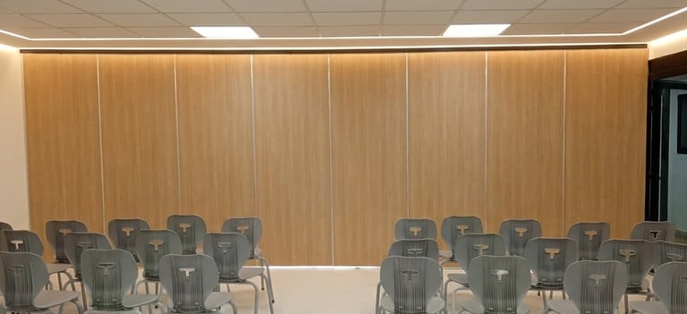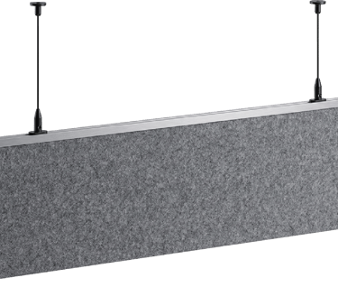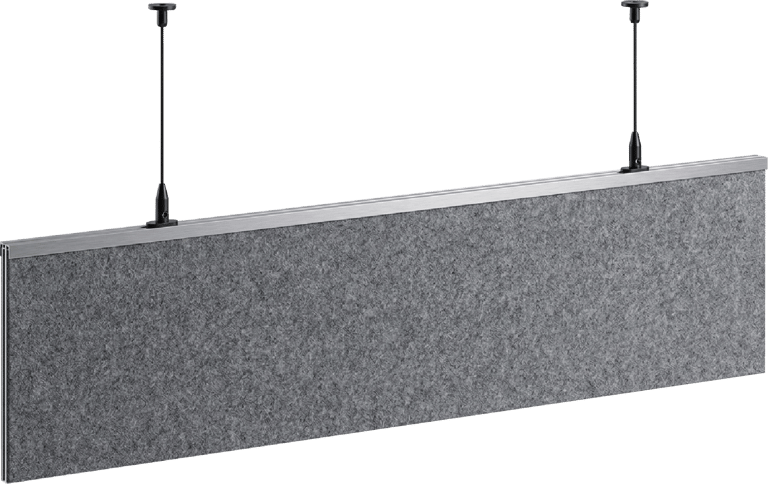 Deflector acústico suspendido en poliéster que absorbe el sonido por ambas caras. La solución perfecta cuando paredes y techo no alcanzan: se instala verticalmente desde el cielorraso y ataca la reverberación de forma directa y eficiente.